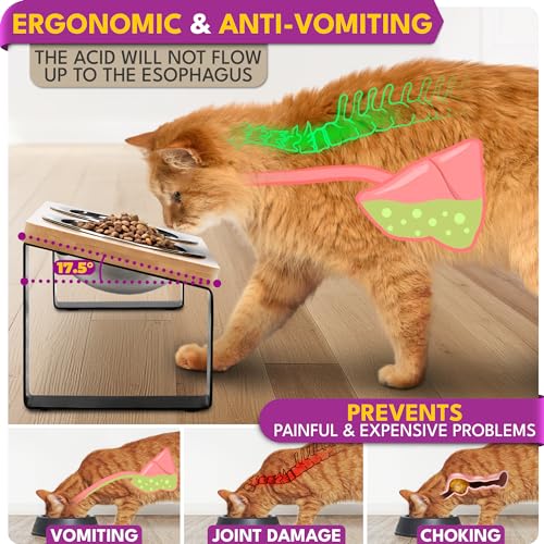 𝗩𝗘𝗧-𝗔𝗣𝗣𝗥𝗢𝗩𝗘𝗗 𝗥𝗔𝗜𝗦𝗘𝗗 𝗖𝗔𝗧 𝗙𝗢𝗢𝗗 𝗕𝗢𝗪𝗟𝗦 – 17° Tilted Design for Optimal Comfort and Anti-Vomitive Benefits: Designed with your cat’s well-being in mind, our cat bowls are tilted at a gentle 17-degree angle, promoting comfortable and stress-free eating sessions while also reducing the risk of vomiting. This ergonomic design helps prevent strain on your pet’s neck and enhances overall mealtime enjoyment.