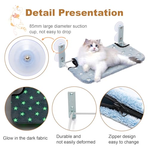 Glow in The Dark Cat Window Perch, Large Foldable Hammock Bed with 4 Strong Suction Cups and Warm Soft Zipper Removable Cushion for Indoor Cats (Stars)