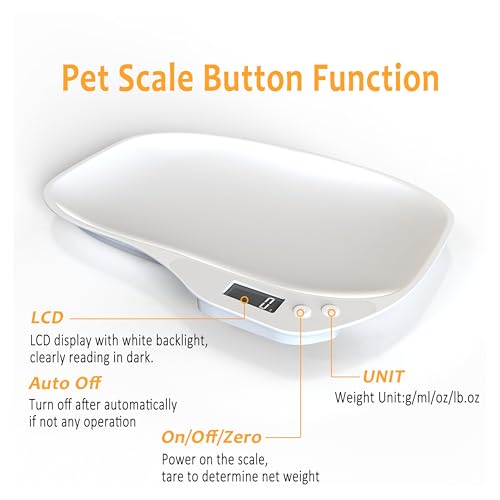 ACCURATE MEASUREMENT: Our LCD electronic weighing scale can weigh in units of g/ml/oz/1b.oz, and can be instantly converted between units by pressing a button. This puppy weight scale can measure weight (maximum: 33 pounds) and length (maximum: 14 inches), making it easy for you to track the weight of your pet and keep it healthy. In addition, you can use it in the kitchen to weigh food accurately.