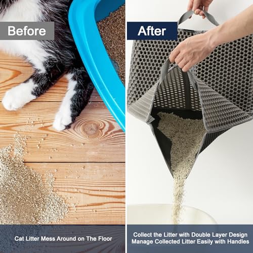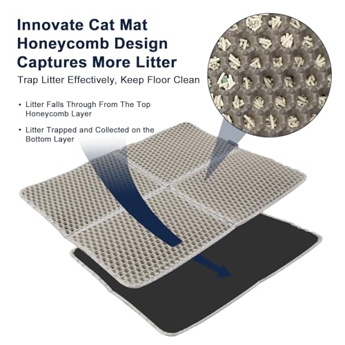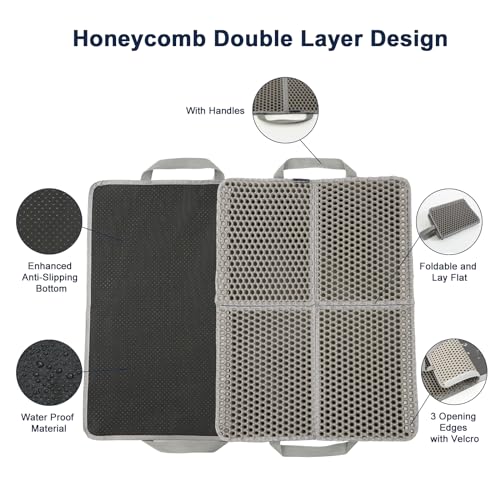 Improved Cat Litter Trapping Mat for Under Cat Litter Box Mat- Protects Floor with Scatter Control Double Layers, Honeycomb Hole, 3 Opening Sides, Handles, Waterproof, Anti-Slip(30×22)