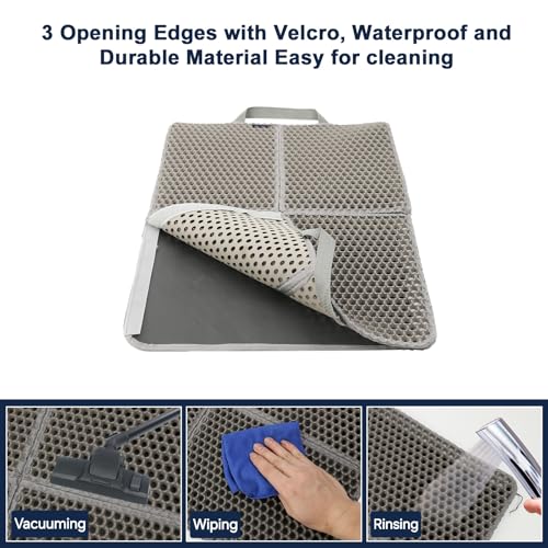 Convenient Three-Sided Opening – Your litter cleanup just got a whole lot easier! This clever kitty litter mat features not one, not two, but three easy-access openings secured with handy hook-and-loop fasteners. No more wrestling with stubborn mats – just pull apart the layers and say goodbye to litter and no mess! And the best part? The waterproof, washable material makes cleaning a breeze. Easy to clean nature allow you to spend less time scrubbing and more time showering your feline friend with love.