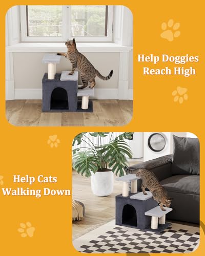 3-in-1 Pet Stairs for Cats, Dog Steps for Small Doggie, 6.29”Depth Cat Stairs, Indoor Cat Ladders for High Bed for Pet’s Joints,Soft Plush, 1 Cat Condo Cave, Sisal Scratching Posts, Grey, Medium