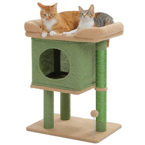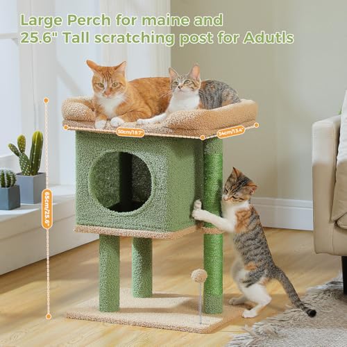 PAWZ Road Cat Tree for Indoor Cats, 26 Inches Cactus Cat Tower with Large Perch, Private Condo, Small Cat Condo with Spring Ball & 2 Scratching Posts for Cats