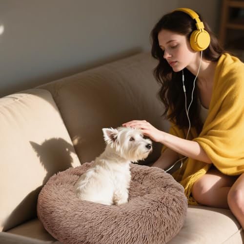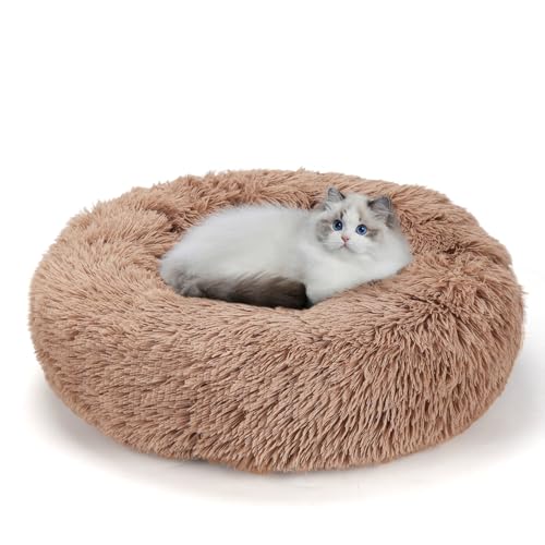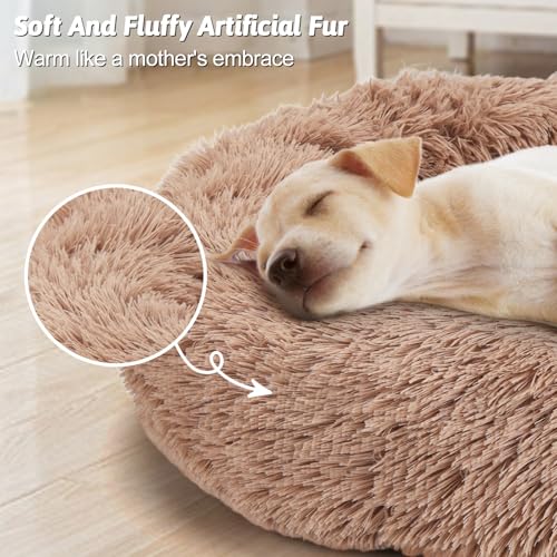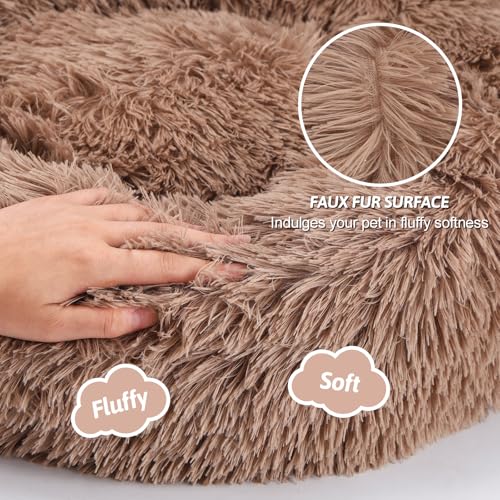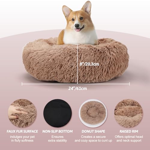 24” Calming Dog & Cat Bed, Anti-Anxiety Donut Dog Cuddler Bed, Warming Cozy Soft Round Dog Bed, Fluffy Faux Fur Plush Dog Cat Cushion Bed for Small Medium Dogs and Cats,Brown