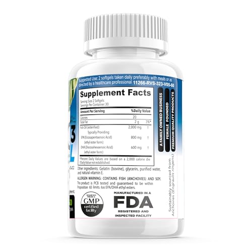 FORTE NATURALS Omega 3 Fish Oil 2000mg 800mg EPA and 600mg per serving is a high potency fish oil supplement that promotes healthy blood circulation and blood flow in men and women. Serving size calls for 2 soft gels making this a 30 day supply. FORTE NATURALS Fish Oil is sourced from deep cold water and is sustainably caught off the coast of Peru and Chine in South America and are NON GMO. Forte Naturals Omega 3 Fish Oil containing 800mg DHA and 600mg EPA is recommended as prenatal DHA as well as a postnatal formula. Daily DHA supplements are also important for lactating breastfeeding mothers. Forte Naturals Fish Oil Omega 3 vitamin supplements are proud to be Made in the USA, Gluten Free, Keto, Paleo, Carnivore Friendly and promotes cardiovascular heart health and blood pressure. Forte Naturals DHA Supplements supports brain and memory function in adults. FORTE NATURALS Omega 3 Fish Oil EPA 600mg + DHA 800mg contain 60 softgels specially formulated for sensitive stomachs and are BURBLESS FISH OIL Supplements to reduce burping and fishy aftertaste. All FORTE NATURALS vitamin supplements are always 3rd party lab tested for purity. FORTE NATURALS is FEMALE FOUNDED vitamin supplement brand.