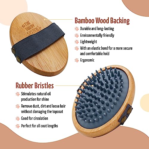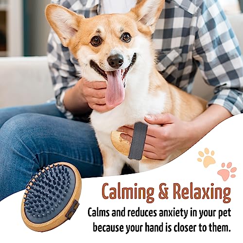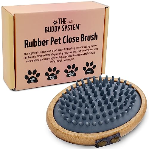 The Buddy System Rubber Pet Close Brush, Soft Touch Oval Palm Brush – Bamboo Massage Handheld with Rubber Bristles and Elastic Band for Dogs and Cats – Gray