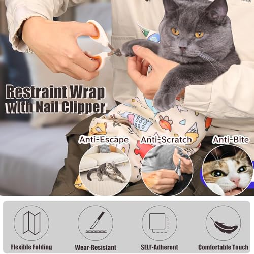 27.6” Cat Grooming Wrap Cat Wrap for Cutting Nails, Anti-Escape Cat Restraint Wraps for Medicine Nail Clipping Ear Cleaning, Self-Adherent Cat Swaddle Wrap with Nail Clipper – Within 15lbs