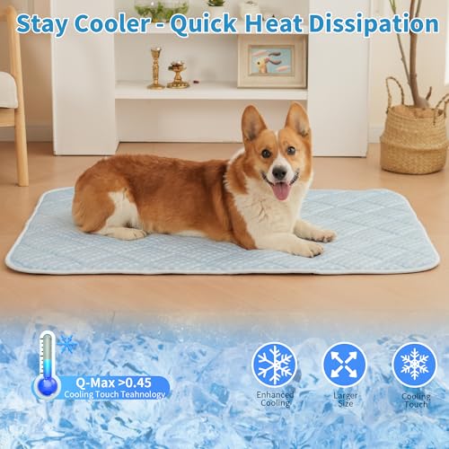🐶❄️[Proven Cooling Performance] Our dog cooling mat is made of cool fabric on the surface, upgraded with pet-tested fabric and design,this cats/dogs cooling mats instantly lowers surface temperature by 4-6°F,with a Q-max range of up to 0.5, suitable for all seasons use. The cooling fabric provides your pet with long-lasting cooling and quick heat dissipation.