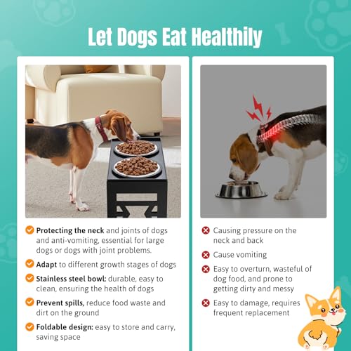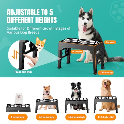 5 ADJUSTABLE HEIGHTS for Dogs of All Ages: This Elevated Dog Bowls Stand can be set to 5 variable heights: 4, 9.5, 10.5, 11.5, and 12.75 inches, catering to the growth of puppies into adult dogs, maintaining a clean and tidy feeding area, enabling dogs comfortable to access their food and water.