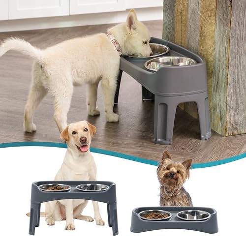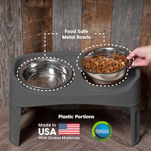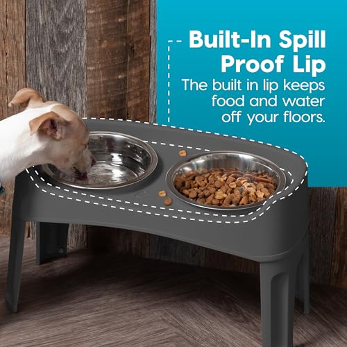 IRIS USA Adjustable Elevated Dog Bowls, Raised Feeder with 2 Stainless Steel 64 oz Bowls, Spill-Guard Rim, 12.25″ or 4.63″ Heights, Durable Plastic, Made in USA, Dark Gray