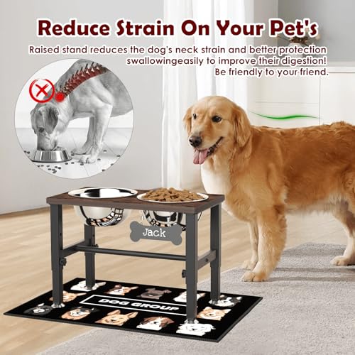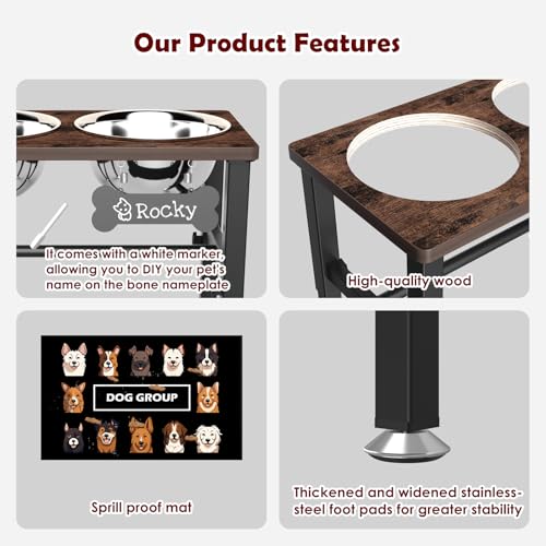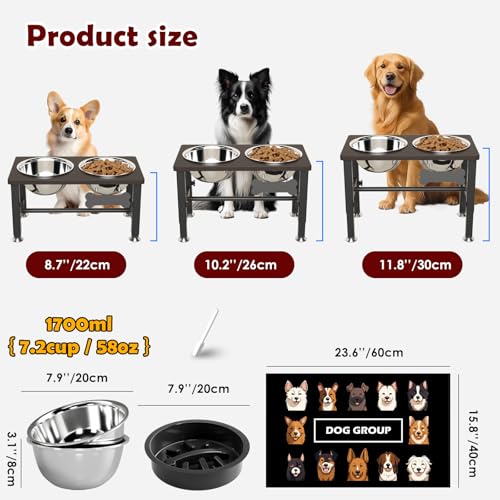 SHAINFUN Elevated Dog Bowls with Slow Feeder & Mat for Medium and Large Dogs, 16″ Tall Adjustable Wooden & Metal Raised Dog Bowl Stand, 2 Stainless Steel 58oz Bowls for Food & Water