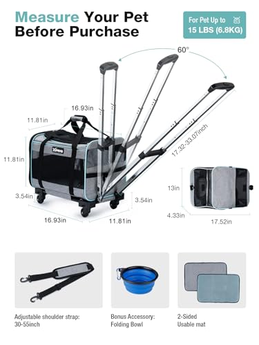 Pet Carrier Airline Approved (Most Airline): Designed to meet TSA standards, this dog carrier fits under the seat of most airlines when the wheels are removed. Pet carrier size: 16.93”L x 11.81”W x 11.81″H (without wheels). Recommend for pets up to 15lbs.
