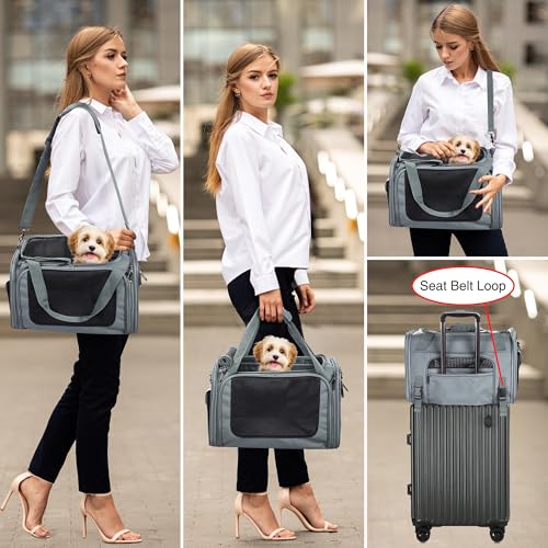Safe & Convenient Travel: Built-in leash, suitcase sleeve, and seat belt loops keep pets secure. Three storage pockets, a poop bag slot, padded handles, and an adjustable shoulder strap provide comfort and organization. The carrier also folds flat for easy storage when not in use
