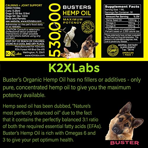 Busters Organic Hemp Oil 530,000 2pack 2month Supply for Dogs and Cats Max Potency Made in USA Omega Rich 3 6 and 9 Hip & Joint Health Natural Soothing Relief