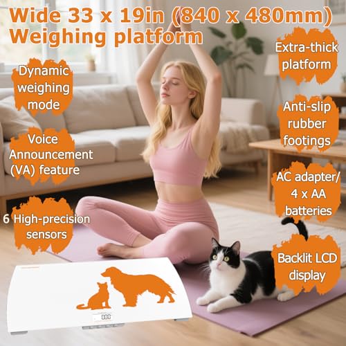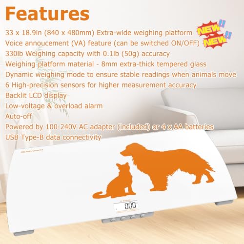 WIDE WEIGHING PLATFORM: This electronic scale has a large 33 x 19 inch (840 x 480mm) tempered glass weighing platform with a 0.3 inch (8mm) extra thickness, fitting most dog and cat breeds and super easy for maintenance.