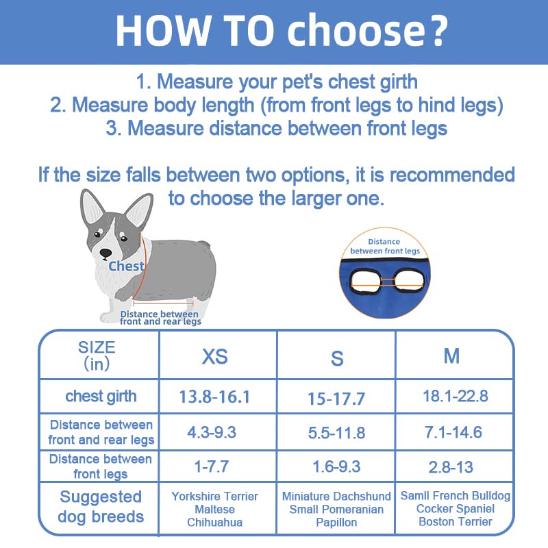 【Important Reminder】: The dog wheelchair for back legs is designed based on your dog’s body measurements. Before purchasing, please measure your pup’s chest circumference, the distance between the front and rear legs, and the space between the two front legs. Then, refer to the size chart for the best fit. Your dog’s weight is not a determining factor.