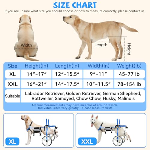 【MEASUREMENT】Please be sure to measure your dog according to our size chart to ensure the perfect fit. Our back leg dog wheelchair frame is adjustable in length, width and height within a certain range to accommodate your dog’s body shape and comfort needs