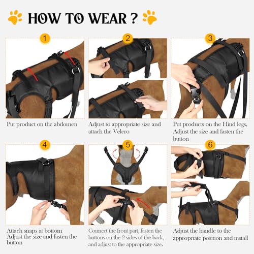 🐶Effortless Wearing and Superior Adjustability: Our dog lift harness features button openings for easy wearing regardless of abdomen or leg size. Say goodbye to struggles and potential leg injuries caused by difficulties in wearing. The support handles can be tailored to your height, ensuring effortless lifting.