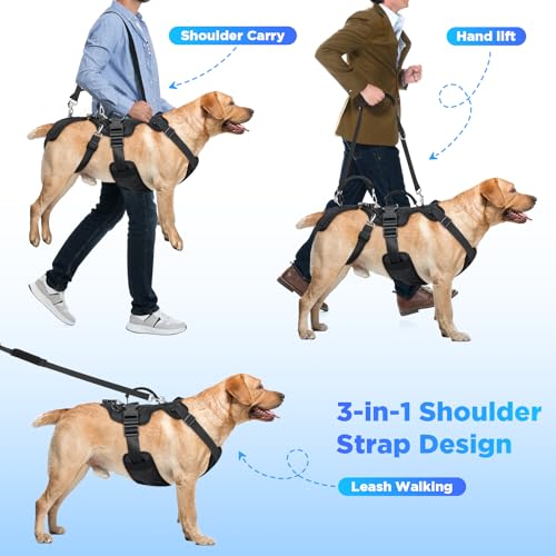 【Dual Handles & 3-in-1 Shoulder Strap】This dog lift harness with handles makes mobility assistance easier and safer. The two padded handles give you firm control when helping your dog into the car or up the stairs, while the detachable shoulder strap offers 3 ways to use: wear over your shoulder for reduced strain, hand-carry for steady support, or convert to a dog leash for everyday walks after recovery. A practical and comfortable dog support sling for large dogs that adapts to every situation.