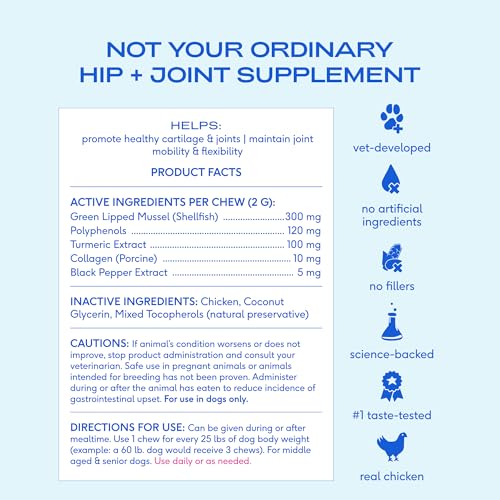EFFECTIVE PAIN RELIEVER FOR JOINT DISCOMFORT: This dog arthritis supplement features vet-recommended ingredients like Turmeric and Green Lipped Mussel. A trusted hip and joint supplement for dogs, it offers lasting relief from stiffness and joint pain.