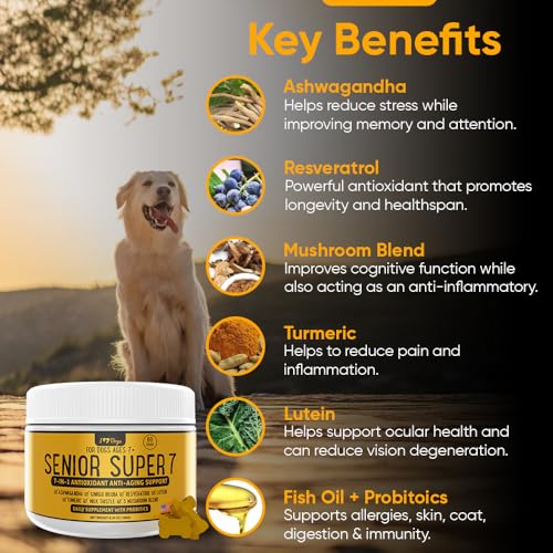 ADDITIONAL SUPPORT: With ashwagandha for stress reduction, resveratrol for antioxidant benefits, and a mushroom blend (lion’s mane, reishi, turkey tail) for improved cognition our Senior Super 7 dog vitamin offers comprehensive support for your aging pup’s overall health and vitality.