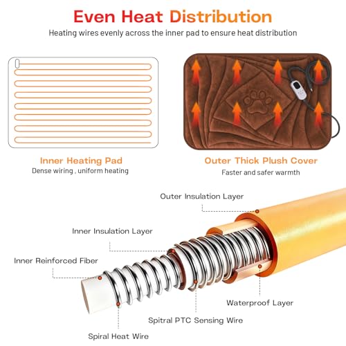 Premium Materials for Comfort: Ultra soft crystal velvet surface offers pets a plush feel. Two layers of insulating cotton filling make the dog heating pad thicker and more comfortable, which can work with the inner heater mat for faster warming while providing fluffy cushioning and extra support.
