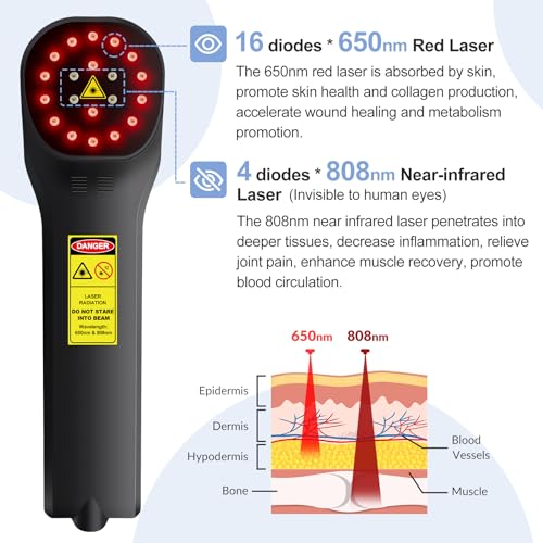 【Infra-Red Laser Therapy for Pets】Our portable light therapy vet device is specially designed for Animals. Laser therapy device for horses is perfect combination of 4pcs x 808nm and 16pcs x 650nm red light. The 808nm near-infrared light therapy is known to penetrate deeply into tissues, organs, & joints to help dogs with arthritis and spinal pain. The 650nm red light laser can easily be absorbed by the skin to improve blood circulation. (808nm is invisible but can be seen by phone’s camera).