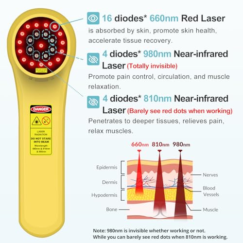 Upgraded lllt low level laser therapy device: The cold laser therapy with 24pcs light beads-16diodes*660nm, 4diodes*810nm and 4diodes*980nm, more diodes have a better treatment effect. 660nm red light is absorbed by the skin, increase blood circulation, heal wounds and decrease infections, 810nm laser penetrate into deeper tissues and joints, help dogs horse cats relieve pain, repair bone and reduce inflammation, 980nm laser improve pain control, circulation and muscle relaxation.