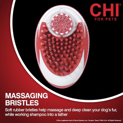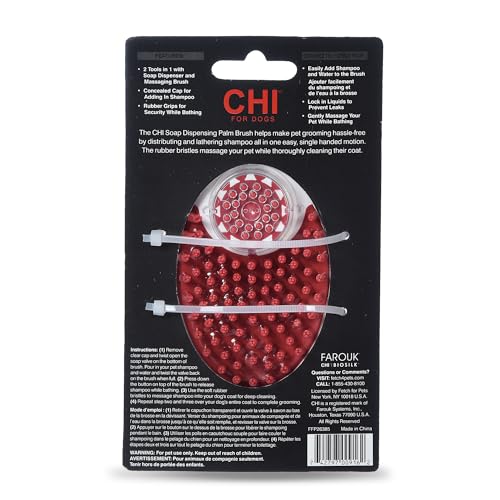 CHI for Dogs provides luxurious and pH balanced formulas designed for optimal care for your dog’s coat and skin. Developed with the same superior technologies as in our professional salon CHI human lines, the formulations are gentle yet effective. CHI for Dogs grooming products provide moisturizing and balancing ingredients that penetrate the coat’s cuticle, strengthening the follicles of the fur as they nourish it from the inside out. CHI for Dogs imparts a superior shine and provides the necessary moisture for a softer, healthier looking dog. CHI for Dogs Soap Dispensing Palm Brush for Dogs features soft rubber bristles that help massage and deep clean your dog’s fur, all the while working shampoo into a lather. Simply add your dog shampoo and a bit of water to thin the solution into the brush, close the cap, and press the button on top of the brush to dispense shampoo as you scrub. This wet brush for dog grooming is designed for use on long hair dogs, short hair dogs, curly coats and more. This dispenser can be used with any liquid dog shampoo, mixed with a small amount of water, and be sure to check out the CHI for Dogs full line of silk therapy dog grooming shampoos. Instructions: Remove clear cap and twist open the soap valve on the bottom of the brush. Pour in your pet shampoo and a small amount of water to thin the solution, and twist the valve back on the brush when full. Press down the button on top of the brush to release shampoo while bathing. Use the soft rubber bristles to massage shampoo into your dog’s coat for deep cleaning. Repeat step two and three over your dog’s entire coat to complete grooming. For pet use only. Keep out of reach of children.