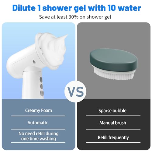 【Switch Button Indicator Light And Instruction Manual】: Flashing red: The device is charging (not fully charged yet). Constantly lit red: The device is fully charged. Green: The device is turned on and in use. Step 1: Add an appropriate amount of body wash to the product container. Step 2: Add an appropriate amount of water after the body wash. Step 3: Close the lid tightly and shake the container thoroughly to mix the body wash and water evenly. Step 4: Start the pump function of the product, and rich bubbles will be generated.