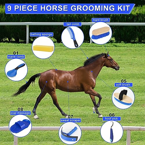 9 Pieces Grooming Kit with Tote Bag – Horse Brush Set, Sweat Scraper, Sponge, Hoof Pick, Curry Comb for Riders and Beginners (Blue)