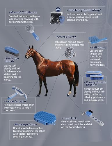 Complete Grooming Kit: This horse grooming kit includes a variety of brushes to meet all your horse grooming needs. It contains a dandy brush, body brush, soft face brush, coarse curry, sweat scraper, hoof pick, tail comb, mane & tail brush, and massage glove, along with a pack of rubber bands for styling the mane and tail. The comprehensive set ensures thorough and detailed cleaning.