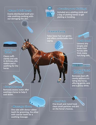 Complete Grooming Kit: This horse grooming kit includes a variety of brushes to meet all your horse grooming needs. It contains a dandy brush, body brush, soft face brush, coarse curry, sweat scraper, hoof pick, tail comb, mane & tail brush, and massage glove, along with a pack of rubber bands for styling the mane and tail. The comprehensive set ensures thorough and detailed cleaning.