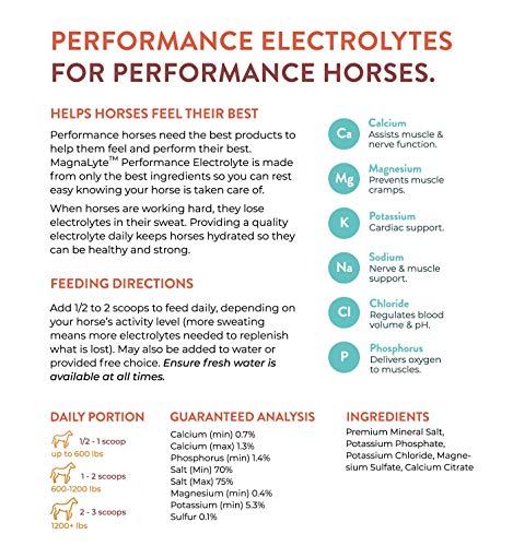 LOOSE MINERAL SALT and ELECTROLYTES: MagnaLyte is a mineral sea salt fortified with the electrolytes every horse needs to stay hydrated. Premium trace mineral salt, potassium, magnesium, phosphorus, and calcium help ensure your horse is staying hydrated.