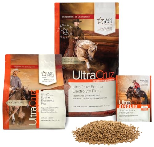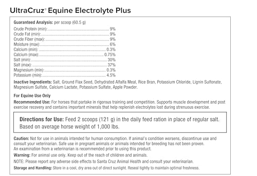 UltraCruz Equine Electrolyte Plus Supplement for Horses is a comprehensive blend of important macro and micro minerals designed to restore electrolyte levels in horses after vigorous exercise or during hot weather. Horses lose electrolytes during work, mainly in the form of sweat. A horse that sweats a lot during hot weather or exercise is at risk for a negative electrolyte balance because of the substantial mineral loss that can occur. Supplementing electrolytes helps replenish electrolytes lost during strenuous exercise, supports muscle development and post-exercise recovery, and may also promote proper hydration by stimulating thirst.