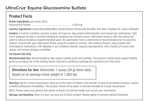 UltraCruz Equine Glucosamine Sulfate Supplement for Horses is designed to support healthy joints and cartilage in horses. It is provided as a palatable pellet or powder. Glucosamine may stimulate the production of proteoglycans, which help maintain the health and resiliency of joints and connective tissue.