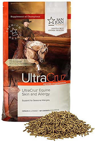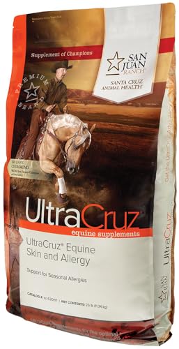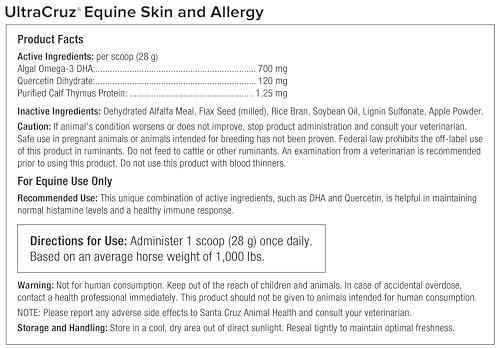 UltraCruz Equine Skin and Allergy Supplement for Horses is a powerful supplement designed to help support horses with seasonal skin allergies. With a potent blend of active ingredients such as Omega-3 DHA (Docosahexaenoic Acid), Calf Thymus extract and Quercetin, this unique formula is helpful in maintaining normal histamine levels.